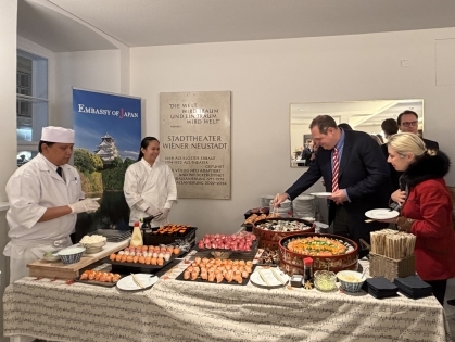 ミクル=ライトナー州首相をはじめ同州政治、経済及び文化芸術などの日墺関係者が参加しました。英語による落語パフォーマンスや津軽三味線の演奏後、大使公邸料理人による寿司の実演を行い、多様な日本文化を紹介する貴重な機会となりました。