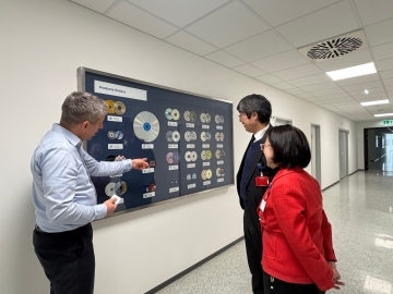 1月9日、岩間大使夫妻はザルツブルク州においてソニーDADCを訪問し、ディートマ-・タンツァー(Dietmar Tanzer)代表ら同社関係者と意見交換を行うとともに、製造工程を視察しました。ソニーDADCは、CD・DVD・プレイステーション用ゲームソフトの製造に加え、ディスク製造技術を応用したマイクロオプティクスの研究開発を進めています。今回の訪問を通じ、日墺間の経済連携の具体的な進展を確認しました。