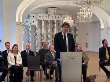 2月18日、岩間大使は、大阪府羽曳野市とウィーン13区(ヒーツィング)の姉妹都市提携30周年記念式典に出席しました。式典はオンラインで開催され、ツィンクル(Johanna Zinkl) 区長らウィーン13区関係者はシェーンブルン宮殿から、山入端創市長ら羽曳野市関係者は羽曳野市から参加しました。