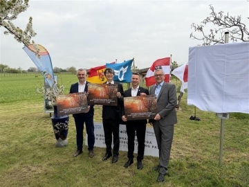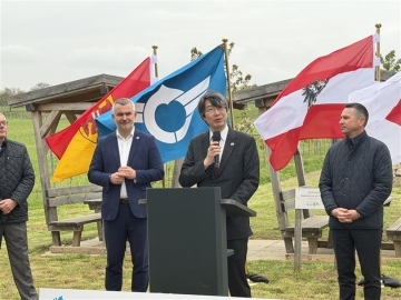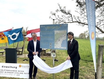また同日、「桜のサイクリングロード滋賀」の開所式が開催され、岩間大使はドルナー・ブルゲンラント州議員らとともに出席しました。挨拶において岩間大使は、両地域の交流の象徴となるサイクリングロードの開所に対する祝意とともに、大使館として、両地域間の交流を引き続き支援し、多岐にわたる分野での交流促進に尽力していきたい旨述べました。さらに、三日月滋賀県知事からの祝辞を代読しました。